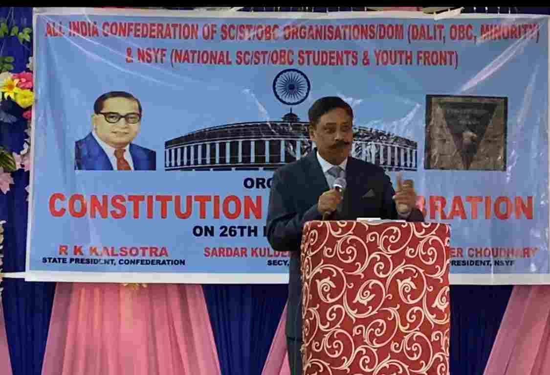 Jammu, 26.11.23: The 74th Constitution Day was fervently celebrated by the All India Confederation of SC/ST/OBC Organisations and its affiliated wings, including Dalit OBC Minority and National SC ST OBC Students & Youth Front J&K, at Perm Resort Muthi, Jammu. In a comprehensive address, RK Kalsotra, State President of the Confederation, delved into the significant facets of the Constitution, acknowledging the profound contributions of Dr. B.R. Ambedkar. He underscored the transformative impact of the Constitution, emphasizing the principles of equality, liberty, fraternity, and justice that Dr. Ambedkar meticulously embedded for universal application, transcending societal divisions.