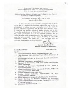 In an order issued on Thursday, Navin K Choudhary, Principal Secretary to the government announced a complete ban on import of poultry and unprocessed poultry meet for any purpose into J&K with immediate effect, till January 14.