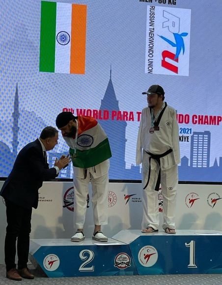 Advisor Farooq Khan congratulates Chandeep Singh for claiming silver at 9th Para World Taekwondo Championships