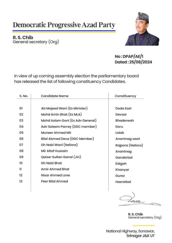 JAMMU, Aug 25: The Democratic Progressive Azad Party’s Parliamentary Board has announced the contesting candidates on 13 Assembly Constituencies of Jammu and Kashmir.