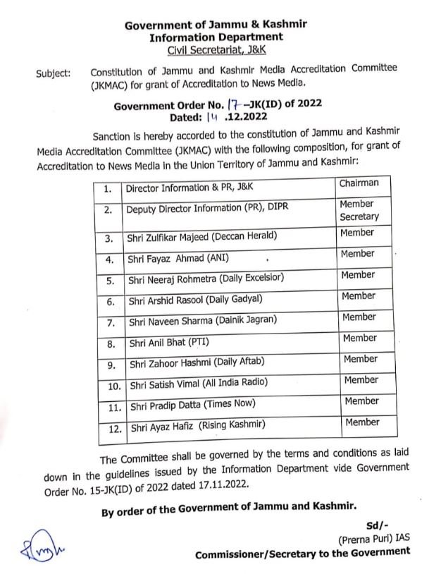 The meeting was attended by Deputy Director Information (PR), Deepak Dubey, who is also the Member Secretary of JKMAC, Zulfikar Majeed (Deccan Herald), Fayaz Ahmad (ANI), Neeraj Rohmetra (Daily Excelsior), Arshid Rasool (Daily Gadyal), Naveen Sharma (Dainik Jagran), Anil Bhat (PTI), Zahoor Hashmi (Daily Aftab), Satish Vimal (All India Radio), Pradip Datta (Times Now) and Ayaz Hafiz (Rising Kashmir) as members in person and through virtual mode.