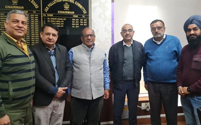 Jammu, 11-02-2025: A delegation of office bearers from the Association of Industries (Regd.) Gangyal, Jammu led by its president, Sh. Virendra Jain, met with the Chairman of the J&K Pollution Control Committee, Jammu, Sh. Vasu Yadav along with Member Secretary Sh. Ghansham Singh, in his office chamber today on 11.02.2025 to discuss crucial issues affecting the industrial sector. The meeting focused on addressing the challenges faced by the industries and exploring ways to promote sustainable development in the region. The Chairman assured the delegation of the board’s support in creating a conducive environment for industries to thrive while adhering to environmental norms.