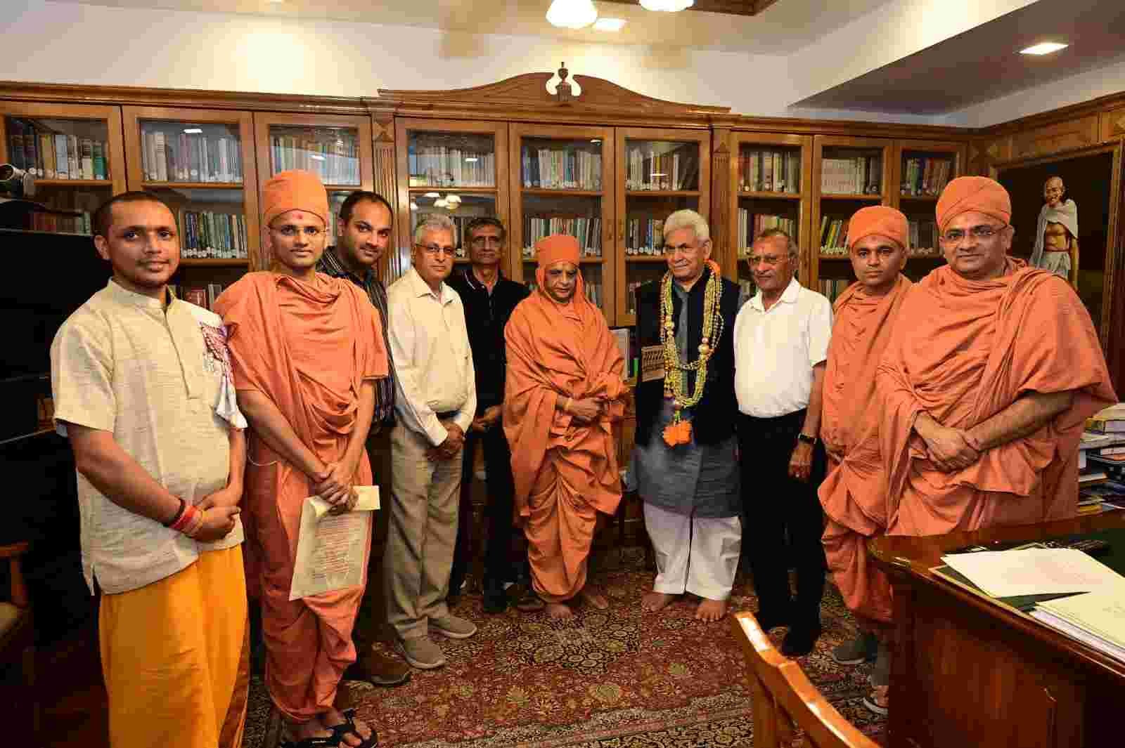 SRINAGAR, JULY 15: Swami Madhavpriyadas, Chairman, Shree Swaminarayan Gurukul Vishwavidya Pratishthanam (SGVP) called on Lieutenant Governor Shri Manoj Sinha at the Raj Bhavan, today.