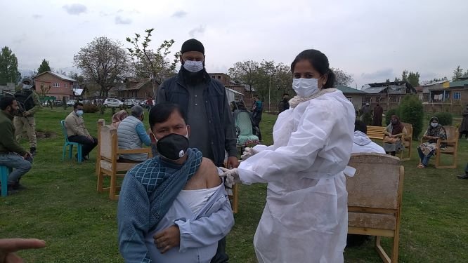 KULGAM, APRIL 20: The District Development Council Chairperson, Mohammad Afzal Parray today received his first shot of the Covid-19 vaccine here.