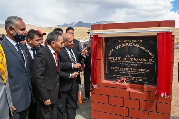KARGIL, APRIL 16, 2022: Justice Pankaj Mithal, Chief Justice of High Court of J&K and Ladakh in presence of Justice Tashi Rabstan, Judge, High Court of J&K and Ladakh and Administrative Judge today laid the foundation stone of District Court Complex Kurbathang, Kragil.