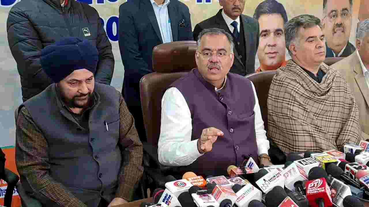 Tarun Chugh, BJP National General Secretary & Incharge BJP J&K and Ravinder Raina, President, Dr. Narinder Singh, National Secretary, J&K BJP along with Ashish Sood, Seh-Prabhari, J&K BJP, Devinder Singh Rana, former MLA, Adv Sunil Sethi, Chief Spokesperson, Adv Abhinav Sharma, Spokesperson and other senior leaders was addressing to the media persons at party headquarters, Trikuta Nagar, Jammu.