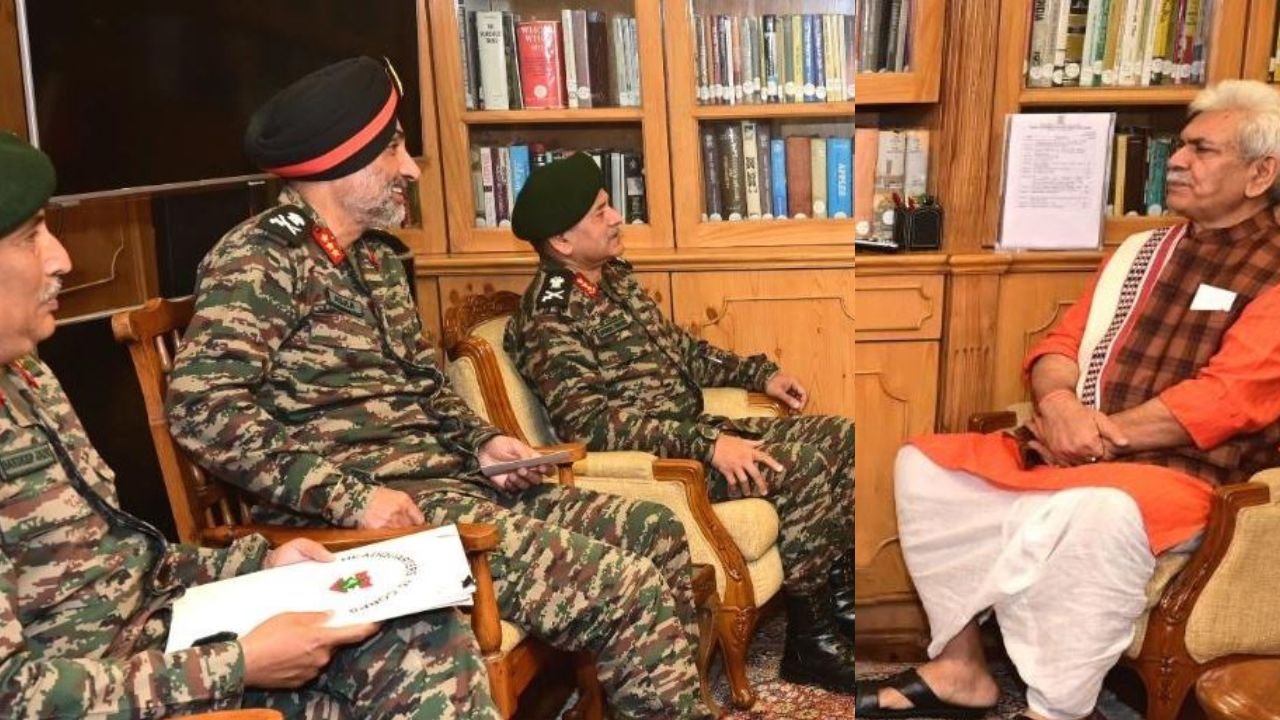 SRINAGAR, JUNE 04: General Officer Commanding-in-Chief (GOC-in-C) Northern Command, Lt General Upendra Dwivedi called on Lieutenant Governor Shri Manoj Sinha at Raj Bhavan, today.