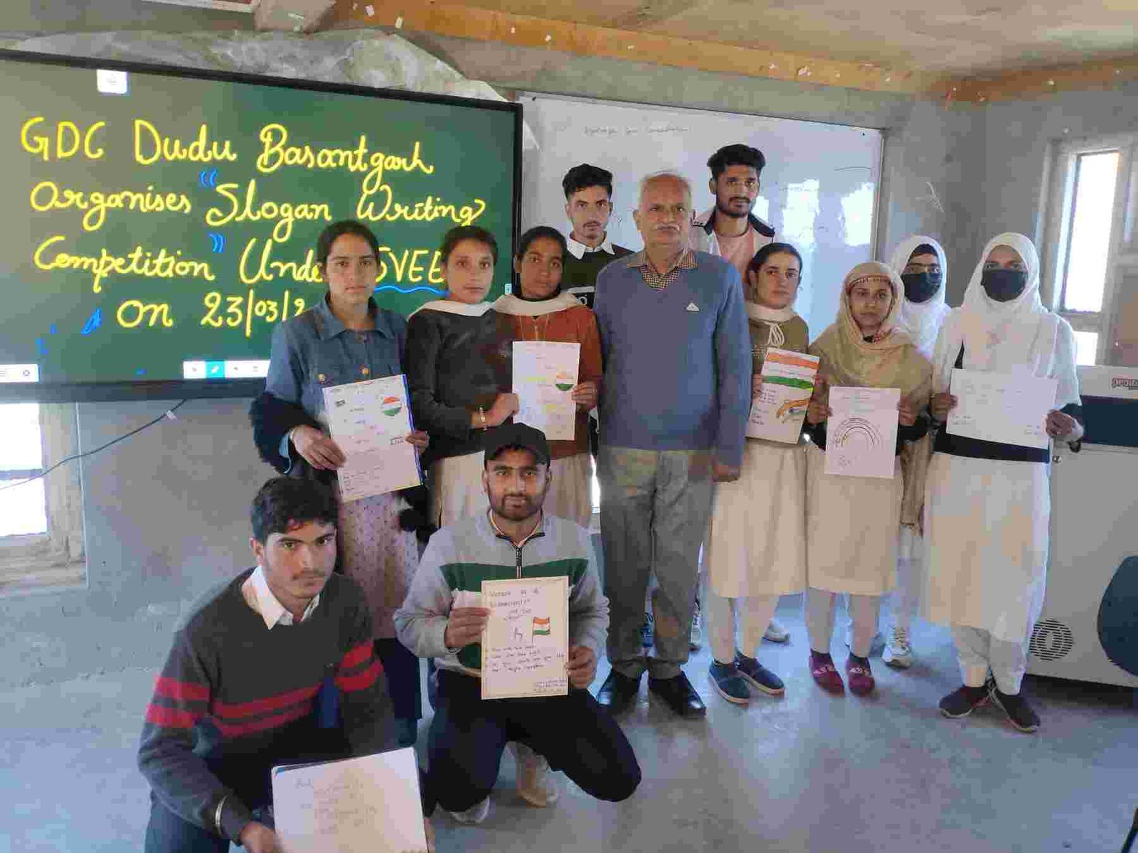 Dudu Basantgarh, 23-03-2024: A slogan writing competition was organized by GDC Dudu Basantgarh on 23 March 2023 under SVEEP. A large number of students participated in the competition. The students were asked to write slogans that could increase the participation of voters in the forthcoming Lok Sabha election. The students wrote beautiful slogans using various colours and inks.