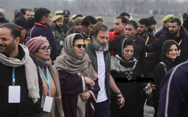 Rahul Gandhi is walking from Chursu with Mufti and a few other women. On the outskirts of Srinagar, at the Birla International School, Pampore, there will be a tea break, and the overnight stop will be at the truck yard.