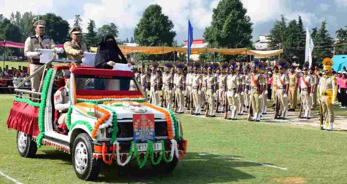 The event featured a march past parade led by Dy S.P G R Bhardhwaj and Parade Contingent including Police, ITBP, IRP, Home Guards, NCC squads, and others, showcasing unity and discipline.
