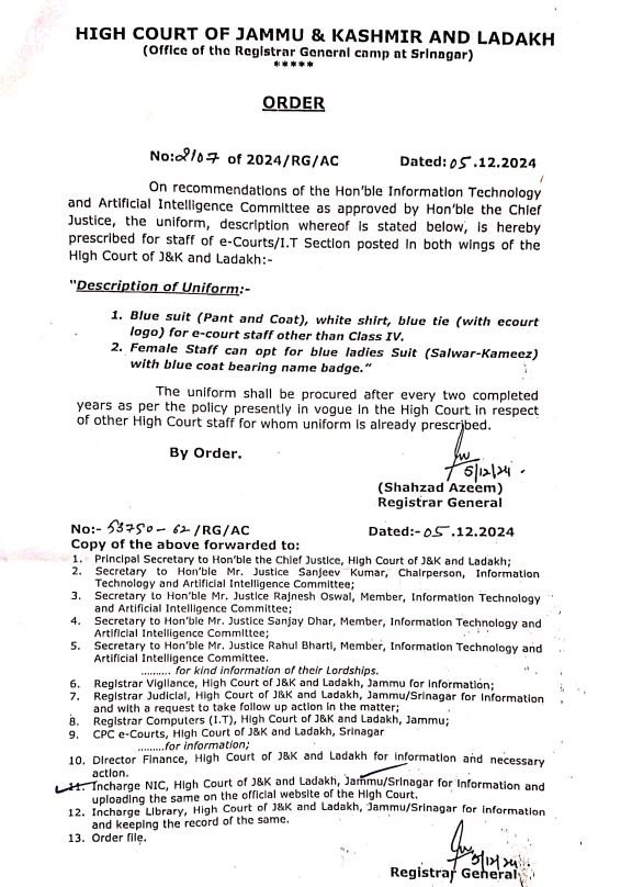 Jammu, Dec 6: In a step towards enhancing professionalism and standardization, the High Court of Jammu & Kashmir and Ladakh has introduced official uniforms for its e-Courts and IT Section staff. The decision stems from the recommendations made by the IT and Artificial Intelligence Committee, which were subsequently approved by the Chief Justice.