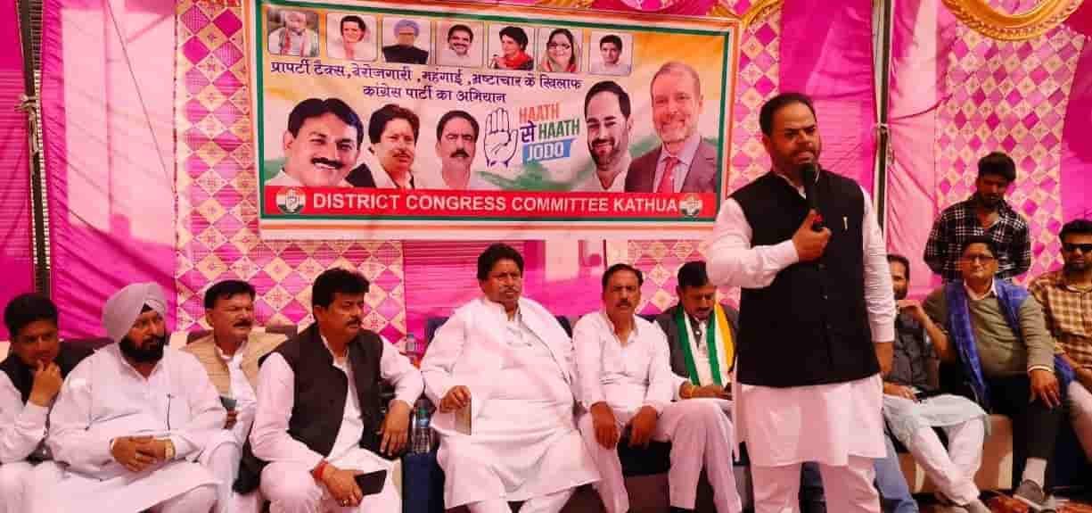 Led by former Union Minister and AICC Incharge Hath Se Hath Yatra campain in J&K, Shri Bharatsinh Solanki, JKPCC President Vikar Rasool Wani,Working President Raman Bhalla, Pankaj Dogra, Narinder Gupta, Nirdosh Sharma, and others, amidst raising slogans “ property tax vapis lo, “ Bulldozer Drive against poor band karo”, “Mehnghai ko kabu karo kabu karo, Berozgari dur karo, Masoomo ki Hatya band karo besides Nafrat Chhodo-Bharat Jodo, the protestors carried play cards, nation flags and party flags. They marched from Ram Leela Ground Kathua to Nagri Adda, in Kthua District along with hundreds of workers. The march started at 9 am &, covered main markets and highway area.