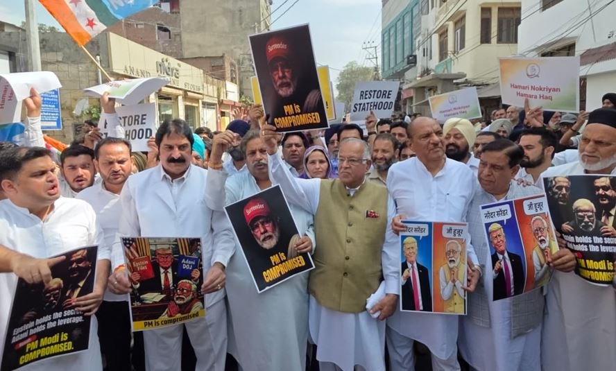 As part of protests announced by JKPCC against the one-sided trade deal imposed by the US due to the alleged surrender of PM Modi before US President Donald Trump for fear of the Epstein files and the Adani case, the Congress today demanded the resignation of Prime Minister Narendra Modi, besides the rollback of the trade deal. The protesters also demanded restoration of much delayed statehood to J&K .