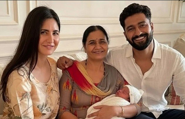 One viral image shows Vicky holding the baby in his arms while Katrina sits beside him in a yellow strappy dress. Another features Katrina cradling her newborn while posing with her mother in law, and a different picture shows Vicky’s mother holding the baby as the couple smiles beside her.