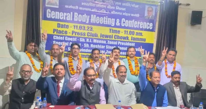 Jammu, 13.03.2023: All India SC/ST/Buddhist LIC Employees Welfare Association held Its General Body Meeting & Conference of Division Srinagar at Jammu which was attend by the employees of Jammu & Kashmir, wherein R L Meena, Zonal President, Hoishar Singh, Zonal Secy, Ravinder Kumar Zonal Treasurer from New Delhi participated as Chief Guest, Special Guest and Guest respectively.