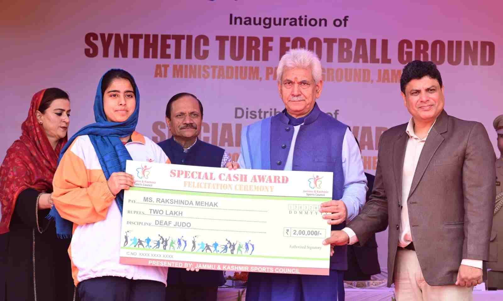 On the occasion, the Lt Governor inaugurated a State-of-the-Art Synthetic Football Turf costing Rs 4.83 Cr at Parade Ground, Jammu. He also laid the foundation stone of the Synthetic Hockey Field at Bandhurakh worth Rs 4.85 Cr.