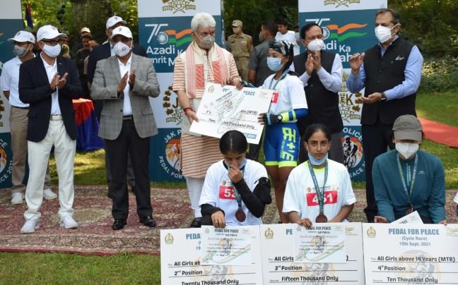 SRINAGAR, SEPTEMBER 19: “Sports can unite people, create hope for a better tomorrow and a brighter future. The youth who are participating today are the epitome of the power of that change and with the efforts of Jammu Kashmir Police, they are becoming champions not only in sports but in their life too”, remarked Lieutenant Governor, Manoj Sinha during the “Pedal for Peace” award ceremony at the Police Golf Course, today.