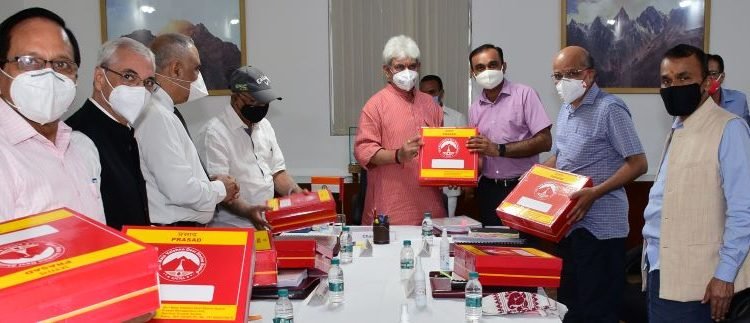 JAMMU, SEPTEMBER 21: The Lieutenant Governor, Manoj Sinha, who is the Chairman of Shri Mata Vaishno Devi Shrine Board, formally launched home delivery of Shri Mata Vaishno Devi Pooja Prasad for devotees who may not be able to visit the famed Hindu pilgrimage, located between three peaked mountains popularly known as ‘Trikuta’, during the Board meeting at the Raj Bhavan here today.