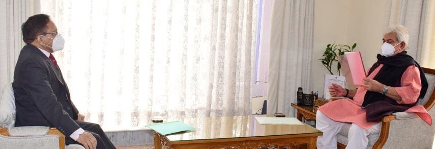 JAMMU, JANUARY 06: Maj Gen (Retd.) SK Sharma, AVSM, Member, Shri Mata Vaishno Devi Shrine Board (SMVDSB) and President Forum for Awareness of National Security (FANS) J&K called on Lieutenant Governor, Manoj Sinha at the Raj Bhavan here today and briefed him on the activities of Shri Mata Vaishno Devi Shrine Board.