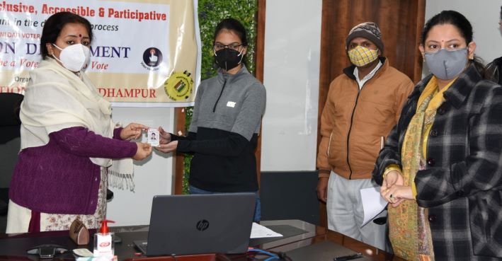 District Election Officer (Deputy Commissioner), Vikas Sharma administered Pledge and distributed Electoral Photo Identity Cards (EPICs) to the newly registered voters. Three Booth level Officers (BLOs) Joginder Singh, Mohammad Ashraf and Bashir Ahmed were felicitated for outstanding performance in the registration of new voters and disseminating awareness in their respective jurisdictions.