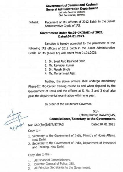 Placement of IAS Officers of 2012 batch in the Junior Administrative Grade Latest NewsTrending News By Bold News Online Desk On Jan 4, 2021 Share IAS Officers of 2012 batchJunior Administrative GradePlacement of IAS Officers Share