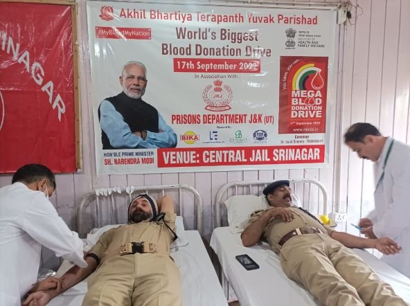 SRINAGAR, SEPTEMBER 17: The J&K Prisons Department in collaboration with Akhil Bhartiya TerapanthYuvak Parishad today organised blood donations camps at 13 prisons of J&K, to commemorate the birthday of Prime Minister and support the country wide mega Blood Donation Drive to raise awareness about humanitarian issue of donation of blood.