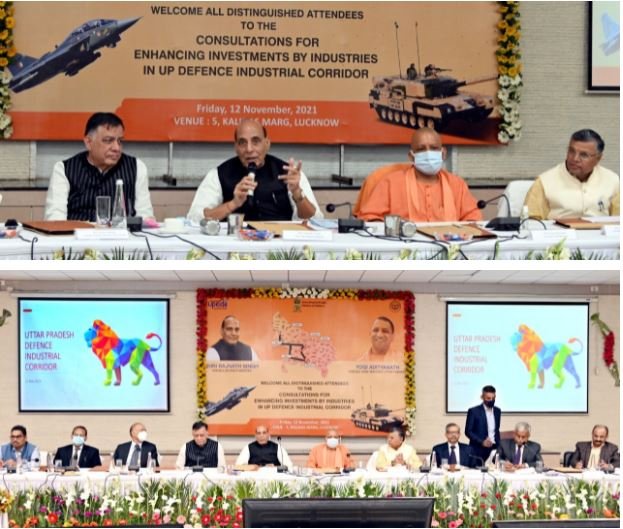 12 NOV 2021: Raksha Mantri Shri Rajnath Singh and Chief Minister of Uttar Pradesh Shri Yogi Adityanath held consultations to enhance investment in the UP Defence Industrial Corridor (UPDIC) at the Chief Minister’s residence in Lucknow on November 12, 2021. The Raksha Mantri listened to the views of representatives of private defence industries present at the meeting and was briefed on the progress of investments in UPDIC.