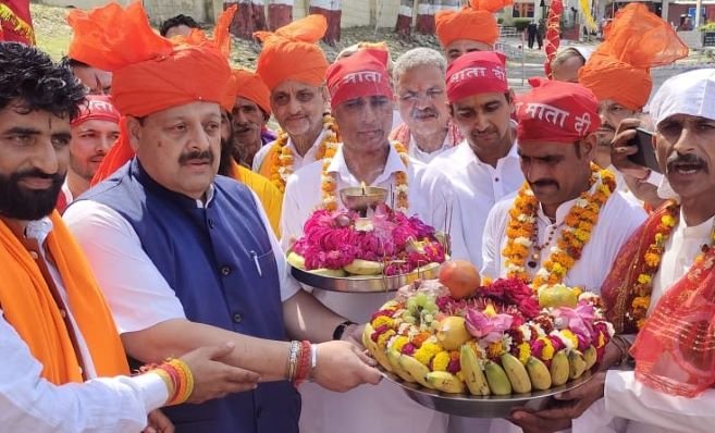 NAGROTA APRIL 03- Amid religious fervour and spiritual serenity—marked by chants of Jai Kara Mata Shera Wali Da—Senior BJP leader Mr Devender Singh Rana, joined by hundreds of devotees, clad in traditional attire, today took the Holy Jyot from the historic heritage Kol Kandoli Temple in a van tastefully decorated with flowers, followed by a cavalcade of bikers, cars and other modes of transport.