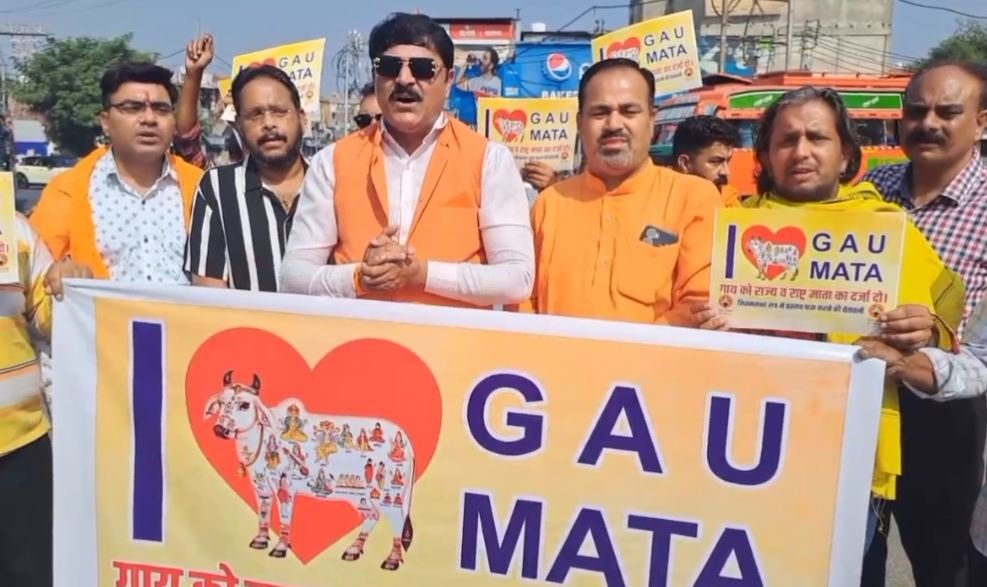 Led by party state chief Manish Sahni, Shiv Sainiks gathered at Dogra Chowk in Jammu and protested vigorously, holding placards that read “I love Gau Mata” and “Declare cow as mother of the state and nation.”