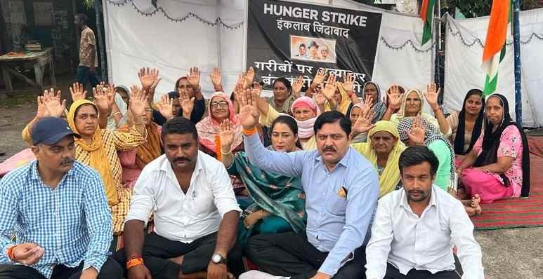 Jammu,04-08-2023. Shiv Sena (UBT) unit today join and supported the hunger strike and darna by local residents at Khulian of RS Pura of Jammu against the decision to install smart-prepaid meters in Jammu.
