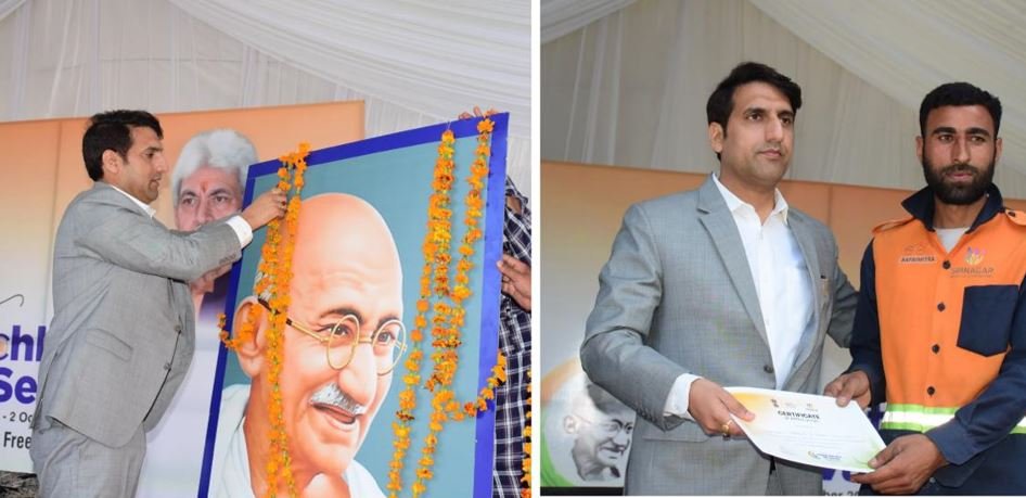 SRINAGAR OCTOBER 02: To commemorate the 154th birth anniversary of Mahatma Gandhi and recognize the invaluable efforts of the Safai Mitras (sanitation workers) in maintaining cleanliness in the City, the Srinagar Municipal Corporation (SMC) Tuesday organized a grand event at Sher-e-Kashmir(SK) Park on the occasion of Gandhi Jayanti.