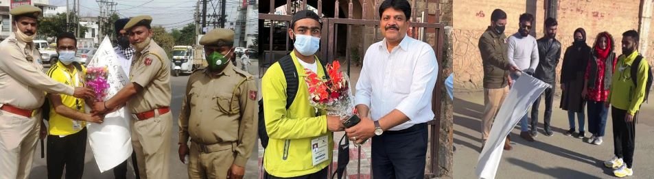 Khan started his journey from Bakhshi Stadium Srinagar after being flagged off by DySP Traffic City Srinagar, GH. Hassan on April- 2 and finished it at Rajghat Delhi on April- 8, 2021, where he was received by CRPF Jawans, presenting him a bouquet.