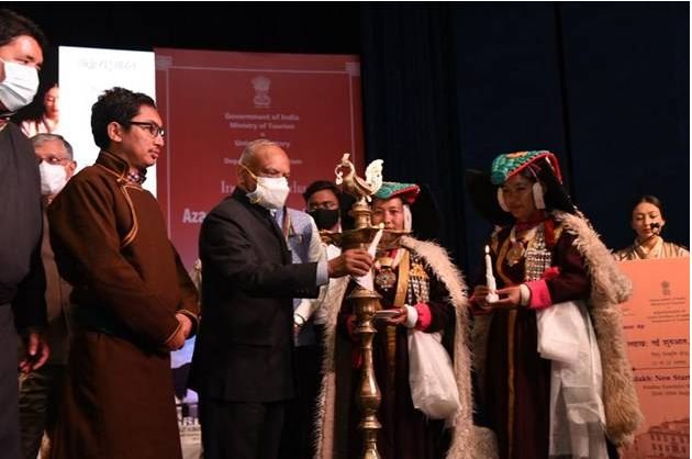 26-08-2021 : Lieutenant Governor of Union Territory of Ladakh Shri Radha Krishna Mathur and Union Minister of Tourism, Culture and Development of North Eastern Region (DoNER) Shri G. Kishan Reddy addressed the mega-tourism event “Ladakh: New Start, New Goals” in Leh today. Shri G. Kishan Reddy graced the event virtually. During the event “A Tourism Vision for Ladakh” document was unveiled which focuses on overall development of the Ladakh Region. The Document envisions promoting tourism in the backdrop of sustainable ecological practices, building on local material and human resources. Member of Parliament of Ladakh Shri Jamyang Tsering Namgyal; Secretary of Tourism & Culture, UT Ladakh Shri K Mehboob Ali Khan; Secretary of Ministry of Tourism, GoI Shri Arvind Singh and other dignitaries also attended the event.