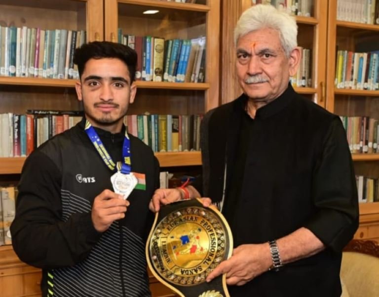 The Lt Governor congratulated the young athlete from Baramulla for clinching the Eurasian Professional Sanda League title in Georgia. He also extended his best wishes to Musharaf Qayoom for his future games.